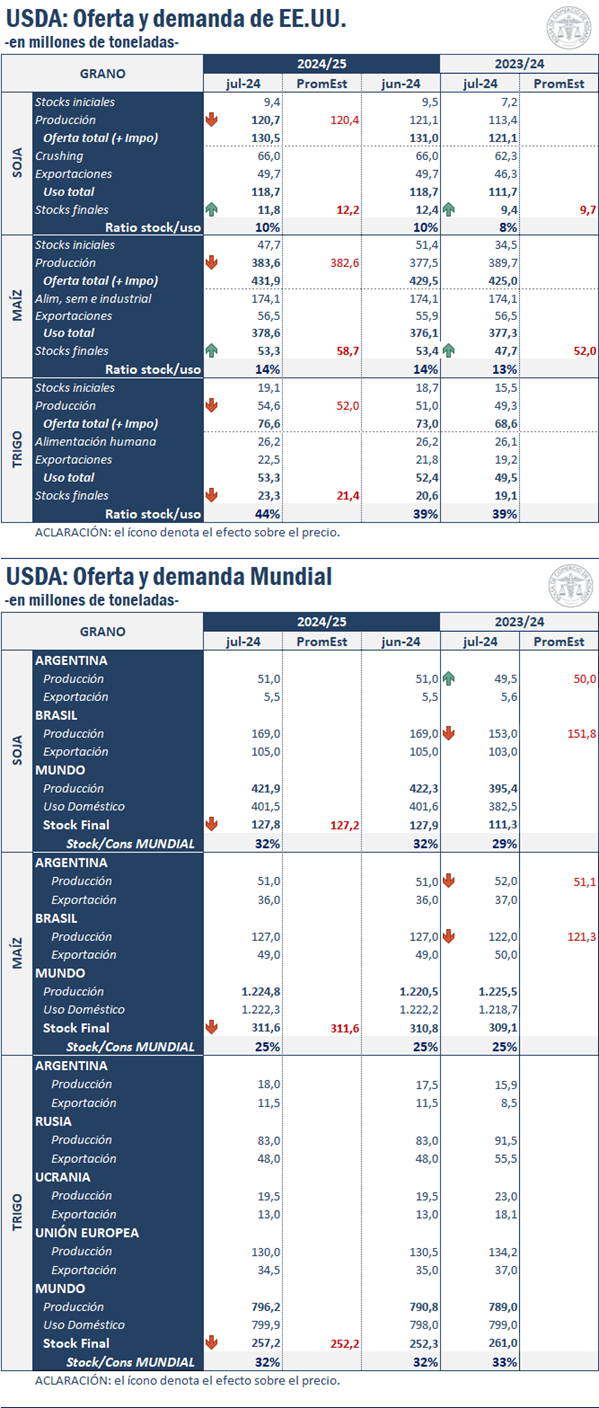 En el día de hoy el Departamento de Agricultura de los Estados Unidos (USDA) publicó un nuevo informe de Estimaciones de Oferta y Demanda Agrícola Mundial (WASDE), donde se dieron a conocer las estimaciones actualizadas de la campaña comercial 2024/25. Los nuevos guarismos impactan al dispar en el Mercado de Chicago.
