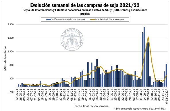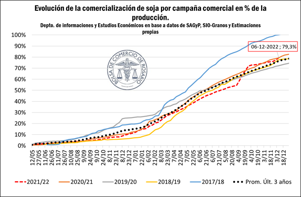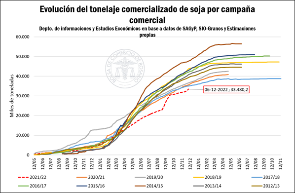 Según los datos oficiales brindados por la Secretaría de Agricultura, Ganadería y Pesca de la Nación, hasta el 30 de noviembre, la comercialización de la campaña había alcanzado 32,6 millones de toneladas. Sumado a esto, se pudo relevar a partir de la información del sistema SIO-Granos, que desde esa fecha hasta el día 6 de diciembre, se habrían realizado contratos por unas 850 mil toneladas de soja adicionales.