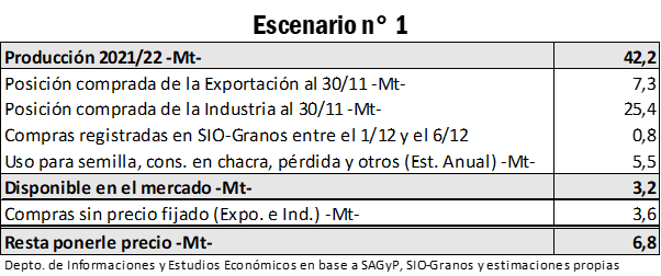 Escenario n°1: estimamos lo que resta comercializar de la campaña 2021/22, sin tener en cuenta la variación en los stocks de soja entre campañas (Δ stock = 0). Así, a lo que se produjo en la campaña le restamos lo que lleva ya comprado el sector industrial y exportador, y el consumo para semillas y otros consumos por fuera del circuito comercial habitual.