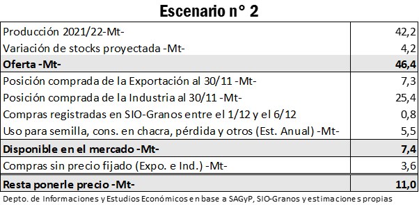 Escenario n°2: en este escenario, a la producción de la campaña 2021/22, le agregamos la diferencia entre el stock inicial y la estimación de stock final para la campaña (Δ stock = 4,2 Mt), lo que suma a la oferta total disponible. Luego procedemos de manera análoga al Escenario n°1.
