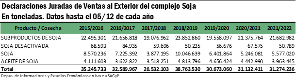 Soja 2021/22. Comercialización externa: las DJVE del complejo soja se ubican en 31,3 millones de toneladas, ligeramente por encima de la campaña pasada