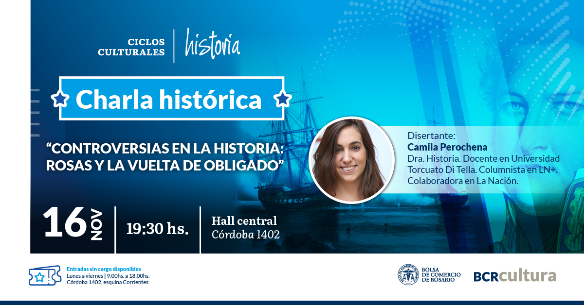 El área de Cultura de la Bolsa de Comercio de Rosario suma a su agenda una charla que invita a reflexionar sobre el pasado de nuestro país: “Controversias en la historia: Rosas y la vuelta de obligado”. La exposición estará a cargo de Camila Perochena, el miércoles 16 de noviembre, a las 19.30, en el hall del edificio sede de la institución (Córdoba 1402).