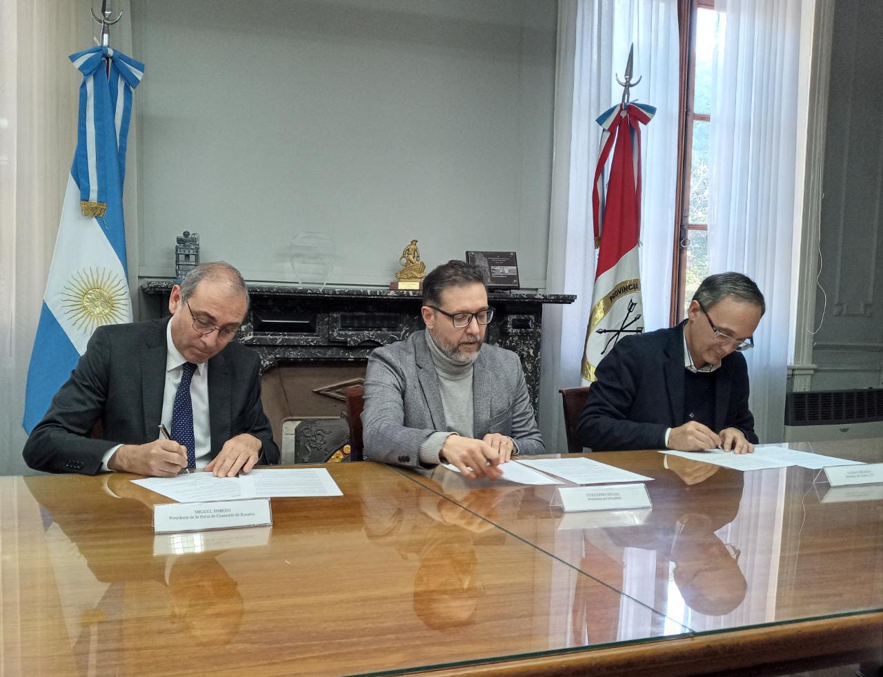 El presidente de la Bolsa de Comercio de Rosario, Miguel Simioni, participó hoy de la firma de un convenio de colaboración junto a los titulares del Ente Administrador del Puerto de Rosario (ENAPRO), Guillermo Miguel, y de la Cámara de la Industria Aceitera de la República Argentina (CIARA), Gustavo Idígoras.
