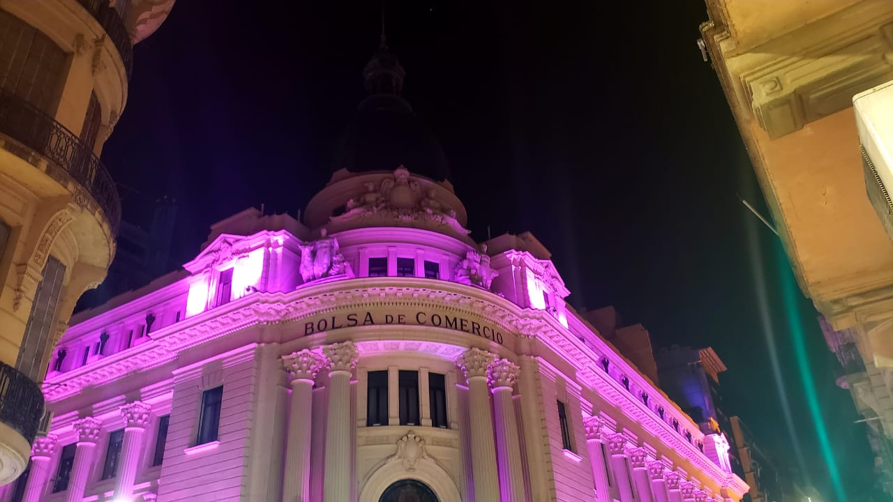 El Edificio Institucional de la Bolsa de Comercio de Rosario permanecerá iluminado durante la noche de color rosa hasta el domingo, en conmemoración de la lucha de la mujer por su participación en pie de igualdad con el hombre en la sociedad y en su desarrollo íntegro como persona.