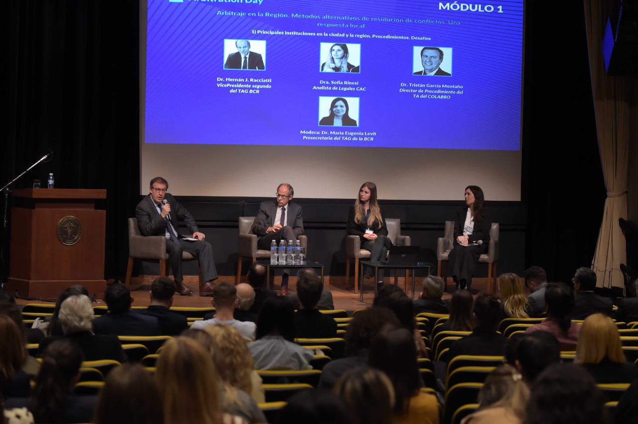 El Dr. Ricardo Moscariello, miembro de la Comisión Revisora de Cuentas de la Bolsa, destacó durante la apertura que el arbitraje como medio alternativo de resolución de conflictos, brinda “mayor celeridad y economía procesal”. Y agregó: “Esto no implica ir contra el sistema de justicia estatal, sino lo contrario: se busca el colaborar con el Estado a fin de que, en aquellos casos donde las partes así lo acuerden, tengan la posibilidad de elegir tanto a quien será quien resuelva el conflicto y la forma en que dirimirá ”.